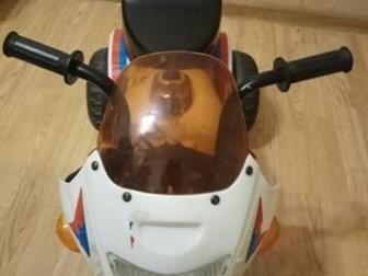 Мотоцикл Bugatiна аккумуляторе, с музыкой, на возраст 3-7 лет, или до 25 кг, максимальная скорость до 2,5км/ч. Аккумулятор заряд держит долго. Есть задний ход. Состояние хорошее (наклейки местами чуток потрепались)